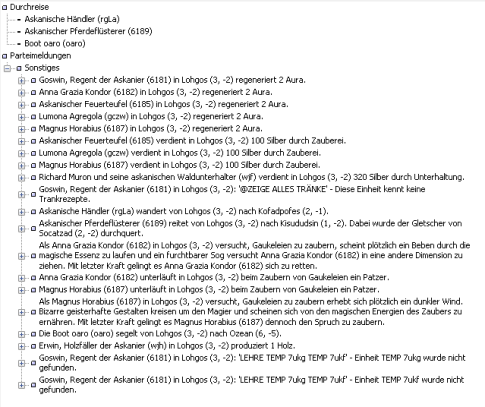 Auszug aus der Befehlsdatei: REGION 3,-2 ; Gosgos ; ECheck Lohn 11 EINHEIT rgLa; Askanische Händler [1,0$] ;bestaetigt VERLASSEN GIB shxb kommando NACH nordwesten EINHEIT wjg; Minarugor, Schiffsbauer der Askanier [1,0$,Soaro] ;bestaetigt MACHE SCHIFF oaro GIB qrh Kommando VERLASSEN EINHEIT qrh; Askanischer Expeditionssegler [1,0$] ;bestaetigt BETRETEN SCHIFF oaro ;Boot oaro NACH südosten südosten südosten EINHEIT wjf; Richard Muron und seine askanischen Waldunterhalter [8,240$] ;bestaetigt UNTERHALTEN TEMP 7ukf 60 Silber TEMP 7ukg 180 Silber !@BEWACHE EINHEIT wjh; Erwin, Holzfäller der Askanier [1,0$] ;bestaetigt MACHEN 1 Holz EINHEIT 3wg4; Askanischer Waffennarr [1,0$] ;bestaetigt LERNE Waffenbau EINHEIT 53bu; Steinbrecher zu Südcircel [1,0$] ;bestaetigt LERNE Unterhaltung BETRETEN SCHIFF oaro ;Boot oaro EINHEIT 6181; Goswin, Regent der Askanier [1,0$] ;bestaetigt LEHREN TEMP 7ukg TEMP 7ukf @ZEIGE ALLES ZAUBER !@BEWACHE @ZEIGE ALLES TRÄNKE @ZEIGE ALLES ZAUBER EINHEIT 6182; Anna Grazia Kondor [1,50$] ;bestaetigt ZAUBERE STUFE 2 Gaukeleien GIB qrh 50 Silber !@BEWACHE EINHEIT 6185; Askanischer Feuerteufel [1,40$] ;bestaetigt ZAUBERE STUFE 2 Gaukeleien !@BEWACHE EINHEIT 6187; Magnus Horabius [1,90$] ;bestaetigt ZAUBERE STUFE 2 Gaukeleien GIB qrh 10 Silber TEMP 7ukf 80 Silber !@BEWACHE EINHEIT 6189; EAskanischer Pferdeflüsterer [1,0$] ;bestaetigt NACH westen westen BENENNEN EINHEIT "Askanischer Pferdeflüsterer" !@BEWACHE EINHEIT 6ds5; Askanischer Gauklerlehrer [1,0$] ;bestaetigt LERNE Unterhaltung EINHEIT 8807; Norgor, wachsames Auge der Askanier [1,0$] ;bestaetigt LERNE Wahrnehmung EINHEIT 8bkr; Askanischer Bergarbeiter [1,0$] ;bestaetigt LERNE Bergbau EINHEIT gczw; Lumona Agregola [1,40$] ;bestaetigt ZAUBERE STUFE 2 Gaukeleien TEMP 7ukf 40 Silber !@BEWACHE EINHEIT Lyxs; Bruder Steiner [1,0$] ;bestaetigt LERNE Burgenbau BETRETEN SCHIFF oaro ;Boot oaro EINHEIT shxb; Stadthalter zu Gosgos [1,0$] ;bestaetigt LERNE Stangenwaffen BENENNEN Region "Lohgos" Beschreiben Region "Dieser freundliche Ort besticht durch seine Vielfalt a\ n Bäumen und Sträuchern unterschiedlichster Art. Durchzogen mit Wegen und P\ ads mit einer Lichtung hier und da, lädt dieser Forst zum verweilen ein." BENENNEN EINHEIT "Stadthalter zu Lohgos" EINHEIT uv7s; Askanischer Wagenbauer [1,0$] ;bestaetigt lernen Holzfällen GIB wjg 1 Holz | ||||
